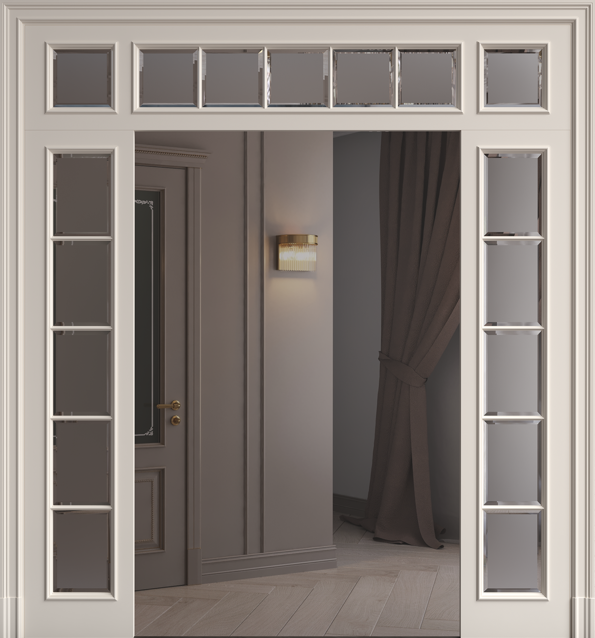 Модель CL-3-12F представляет собой открытую входную группу, дополненную сложной системой фрамуг. Главным отличием этой модификации (индекс «F») является наличие фацета на каждом стеклянном элементе, что визуально «углубляет» конструкцию и превращает обычный дверной проем в роскошный световой объект.